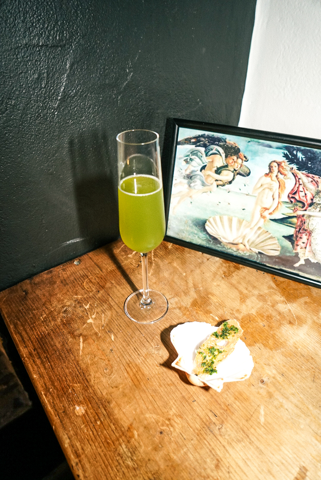 45 ml Calvados 3 years AOC Calvados Pays d’Auge 15 ml homemade syrup (sugar syrup / parsley / garlic / salt) 15 ml verjus 5 ml chamomile 75 ml brut champagne